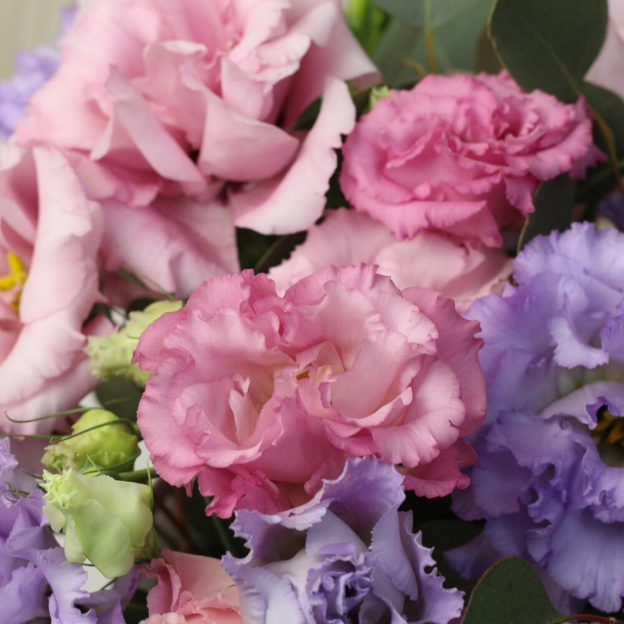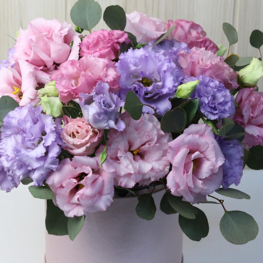 Букет из 15 розовых и сиреневых эустом в коробке в Ижевске