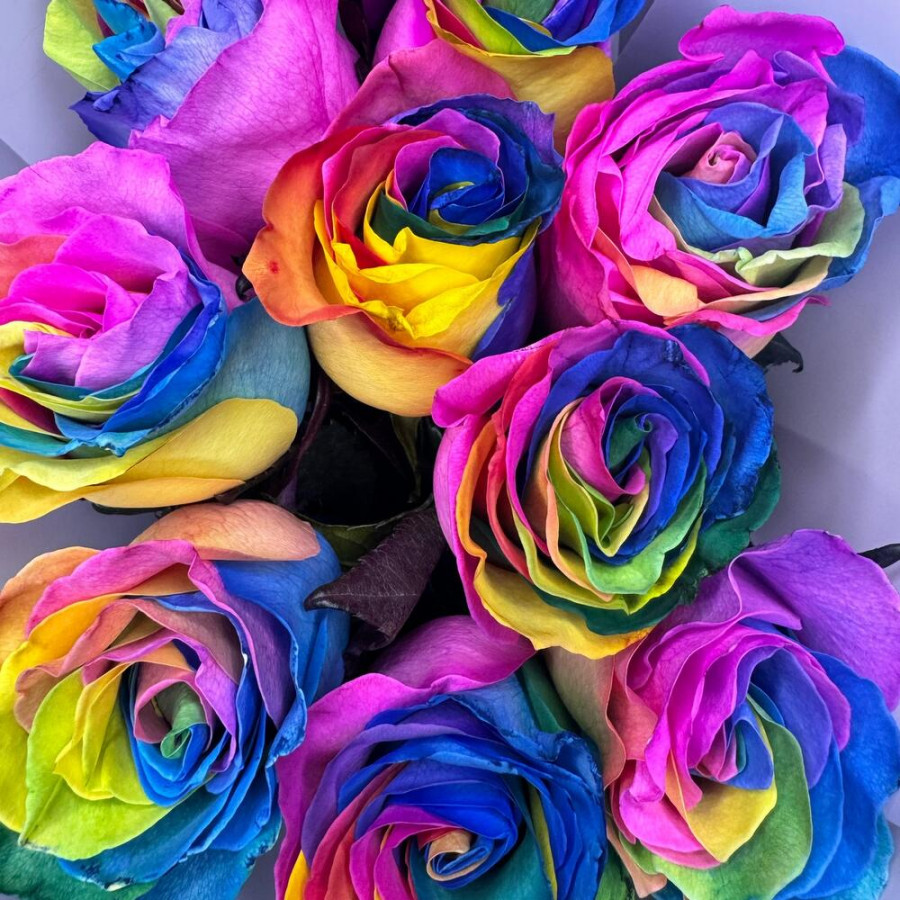 На фото букет из 17 радужных роз. В составе: роза 17 шт, крафт-бумага 2 шт, атласная лента 1 шт, . Все цветы свежие и ароматные, букет красиво оформлен и отлично подходит для подарка. Доступна доставка цветов или самовывоз.
