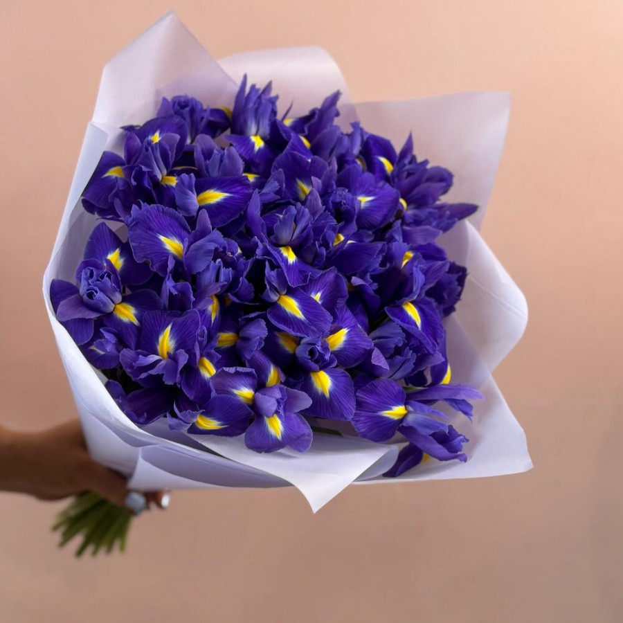 На фото букет из 25 синих ирисов. В составе: ирис 25 шт, дизайнерская упаковка 1 шт, атласная лента 1 шт, . Все цветы свежие и ароматные, букет красиво оформлен и отлично подходит для подарка. Доступна доставка цветов или самовывоз.