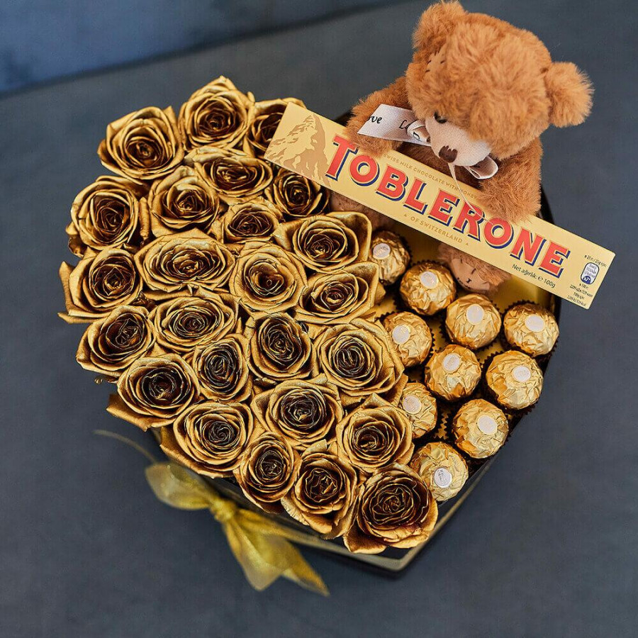 На фото букет из 31 золотой розы с конфетами. В составе: роза 31 шт, плюшевый мишка 1 шт, ferrero rocher 20 шт, коробка (m) 1 шт, атласная лента 1 шт, . Все цветы свежие и ароматные, букет красиво оформлен и отлично подходит для подарка. Доступна доставка цветов или самовывоз.