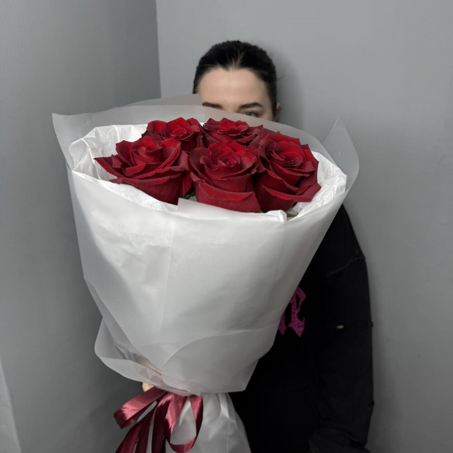 На фото букет из 5 бордовых роз. В составе: роза 5 шт, дизайнерская упаковка 1 шт, атласная лента 1 шт, . Все цветы свежие и ароматные, букет красиво оформлен и отлично подходит для подарка. Доступна доставка цветов или самовывоз.