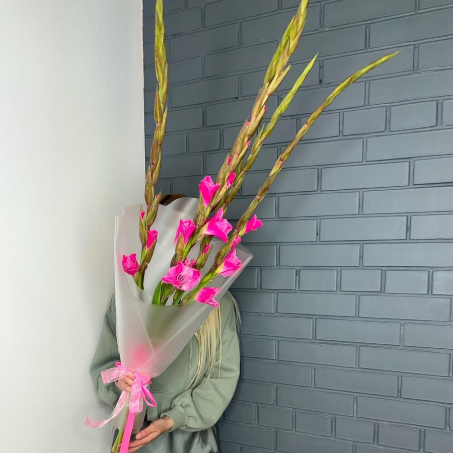 Атласная лента - 3 шт. Гладиолус - 5 шт. Дизайнерская упаковка - 1 шт.