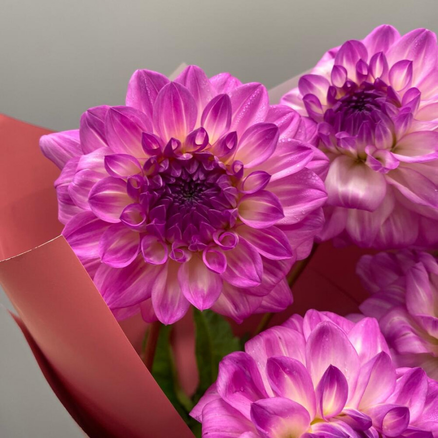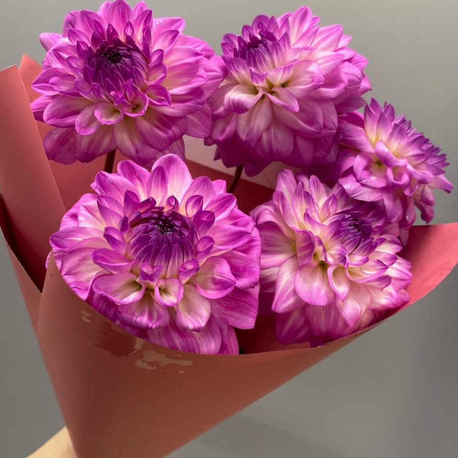 На фото букет из 5 розово-сиреневых георгин. В составе: георгина 5 шт, дизайнерская упаковка 1 шт, атласная лента 2 шт, . Все цветы свежие и ароматные, букет красиво оформлен и отлично подходит для подарка. Доступна доставка цветов или самовывоз.