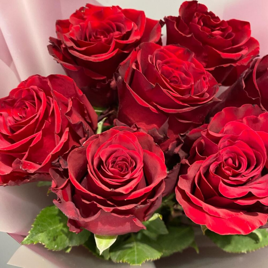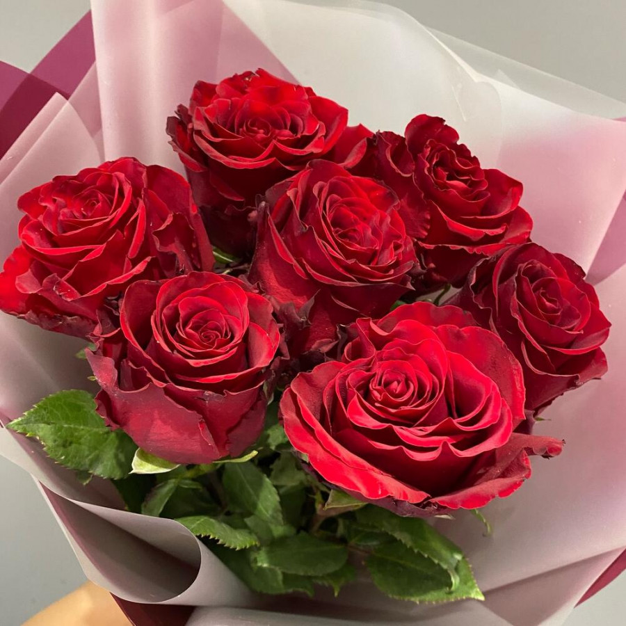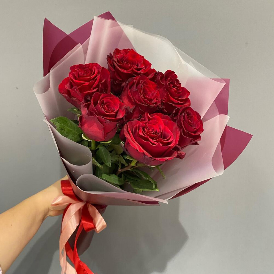 На фото букет из 7 бордовых роз. В составе: роза 7 шт, дизайнерская упаковка 1 шт, атласная лента 1 шт, . Все цветы свежие и ароматные, букет красиво оформлен и отлично подходит для подарка. Доступна доставка цветов или самовывоз.
