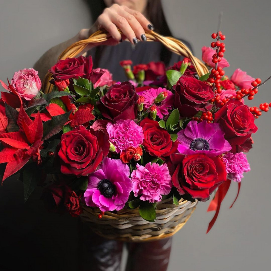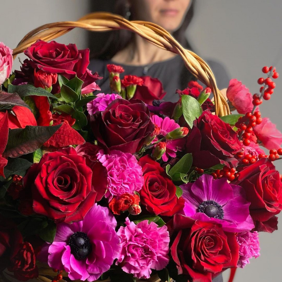 На фото бизнес корзина с красными анемонами. В составе: анемон 5 шт, гербера 6 шт, роза 11 шт, гвоздика кустовая 7 шт, корзина (l) 1 шт, . Все цветы свежие и ароматные, букет красиво оформлен и отлично подходит для подарка. Доступна доставка цветов или самовывоз.