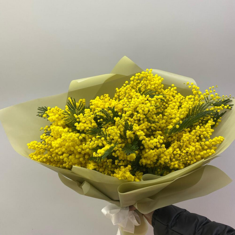 На фото большой букет из мимозы. В составе: мимоза 29 шт, дизайнерская упаковка 1 шт, атласная лента 1 шт, . Все цветы свежие и ароматные, букет красиво оформлен и отлично подходит для подарка. Доступна доставка цветов или самовывоз.