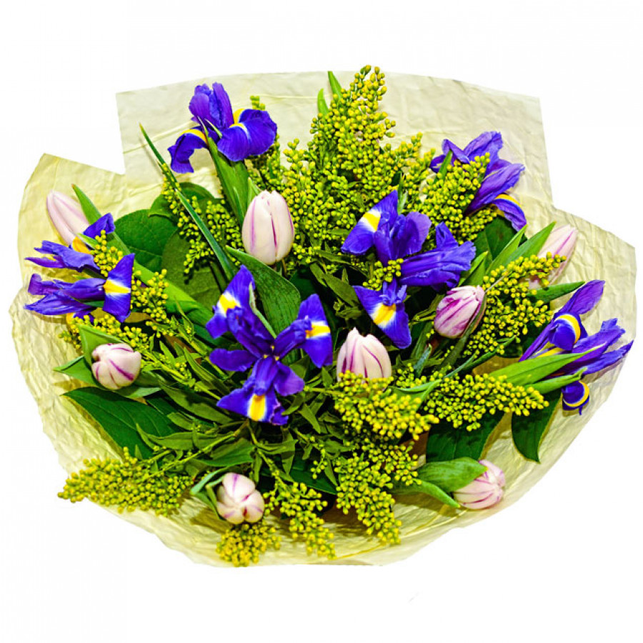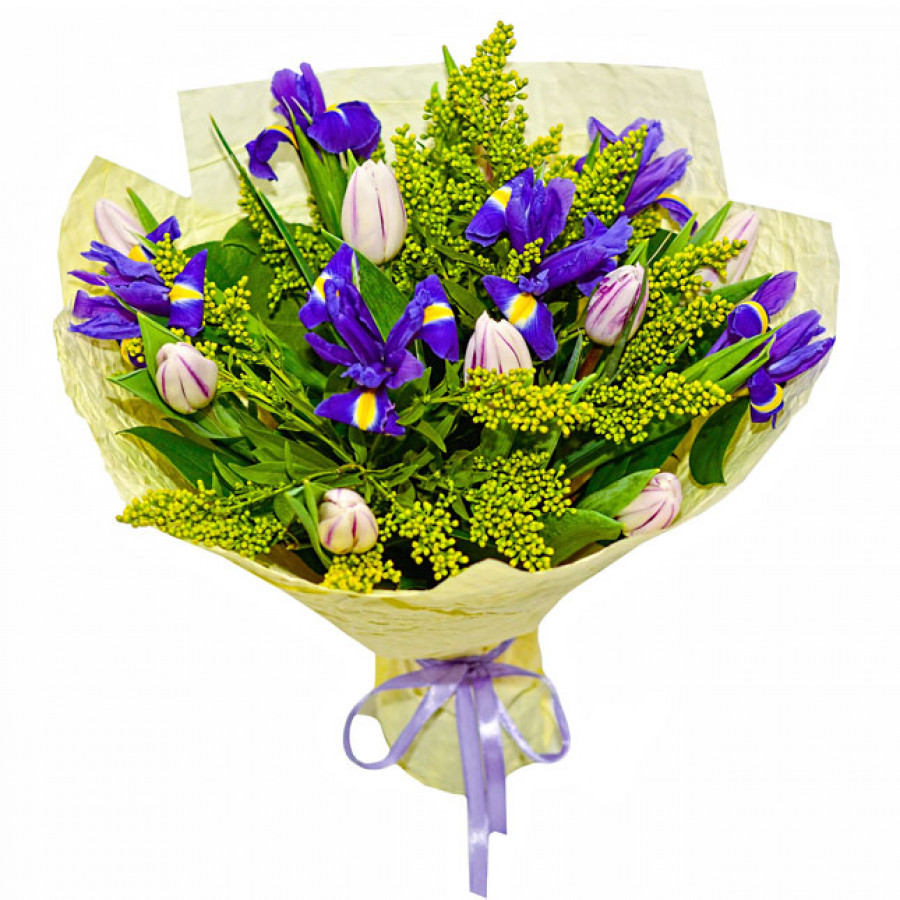 Если хочется подарить весеннее тепло и краски близкому человеку, просто напомните ему о теплом апреле чудесным букетом из 9 нежных тюльпанов, 6 ярких ирисов и 4 солидаго, так напоминающей мимозу. Такой букет станет приятным напоминанием о теплом солнчном апреле, капели и приближающемся лете.