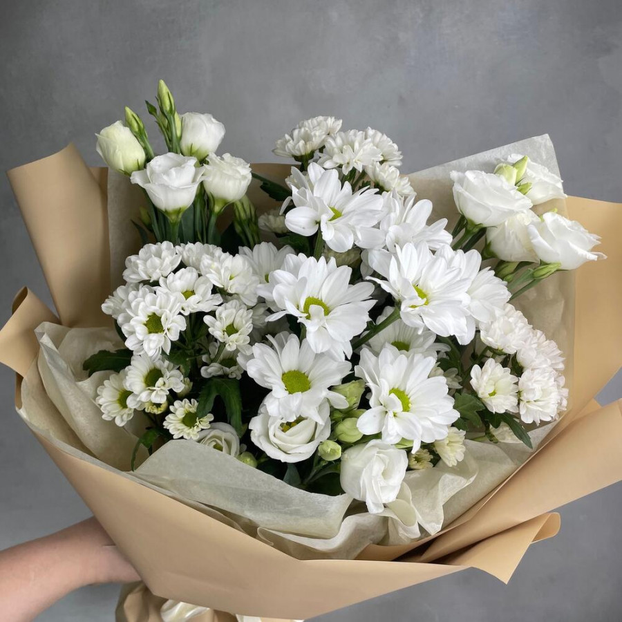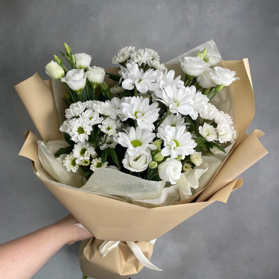 На фото букет из белых хризантем и эустом. В составе: альстромерия 3 шт, хризантема кустовая 4 шт, дизайнерская упаковка 1 шт, атласная лента 1 шт, . Все цветы свежие и ароматные, букет красиво оформлен и отлично подходит для подарка. Доступна доставка цветов или самовывоз.