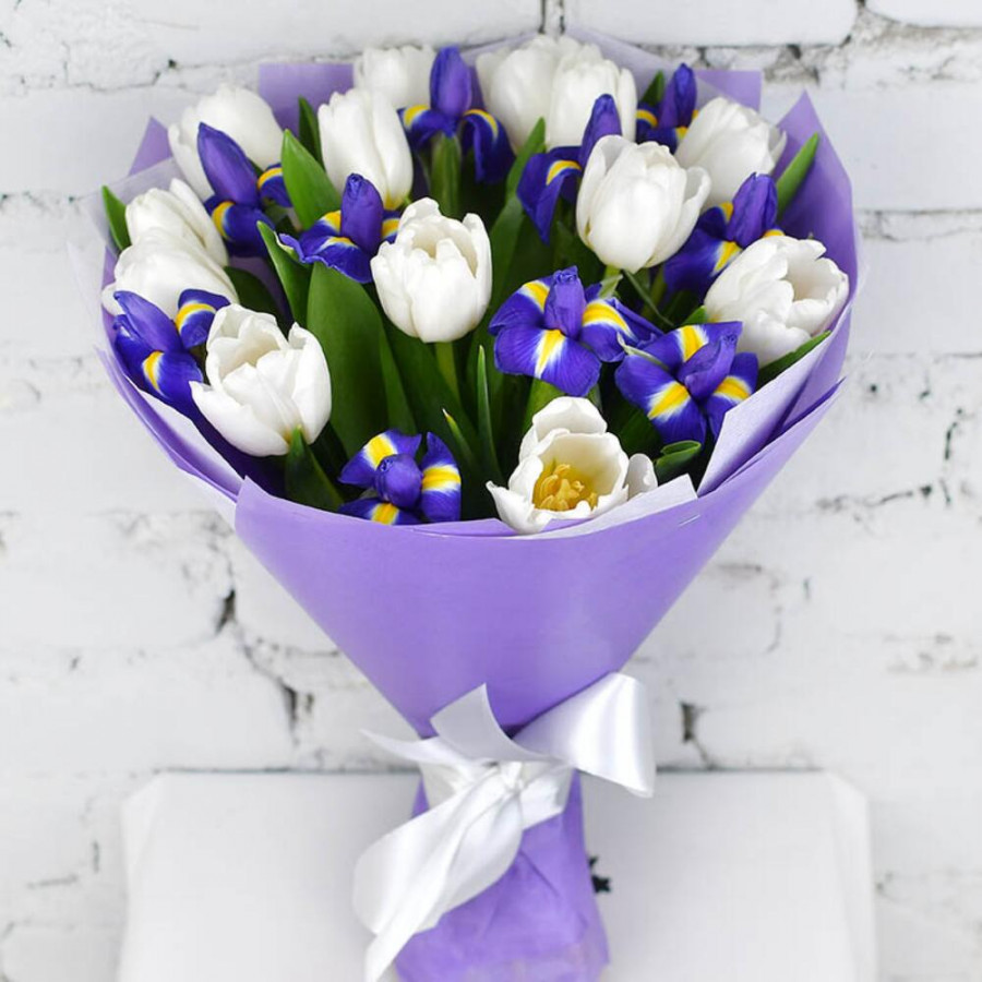 На фото букет из синих ирисов и белых тюльпанов. В составе: ирис 10 шт, тюльпан 13 шт, крафт-бумага 1 шт, атласная лента 1 шт, . Все цветы свежие и ароматные, букет красиво оформлен и отлично подходит для подарка. Доступна доставка цветов или самовывоз.