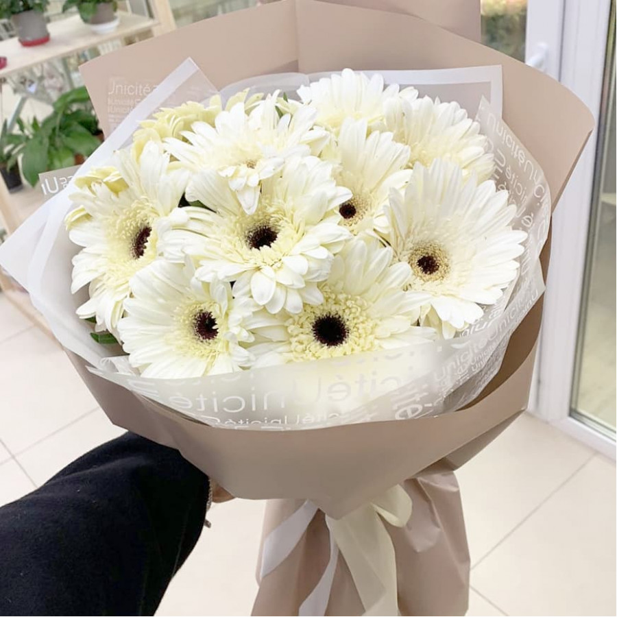 На фото букет из 11 белых гербер. В составе: гербера 11 шт, крафт-бумага 1 шт, атласная лента 1 шт, . Все цветы свежие и ароматные, букет красиво оформлен и отлично подходит для подарка. Доступна доставка цветов или самовывоз.