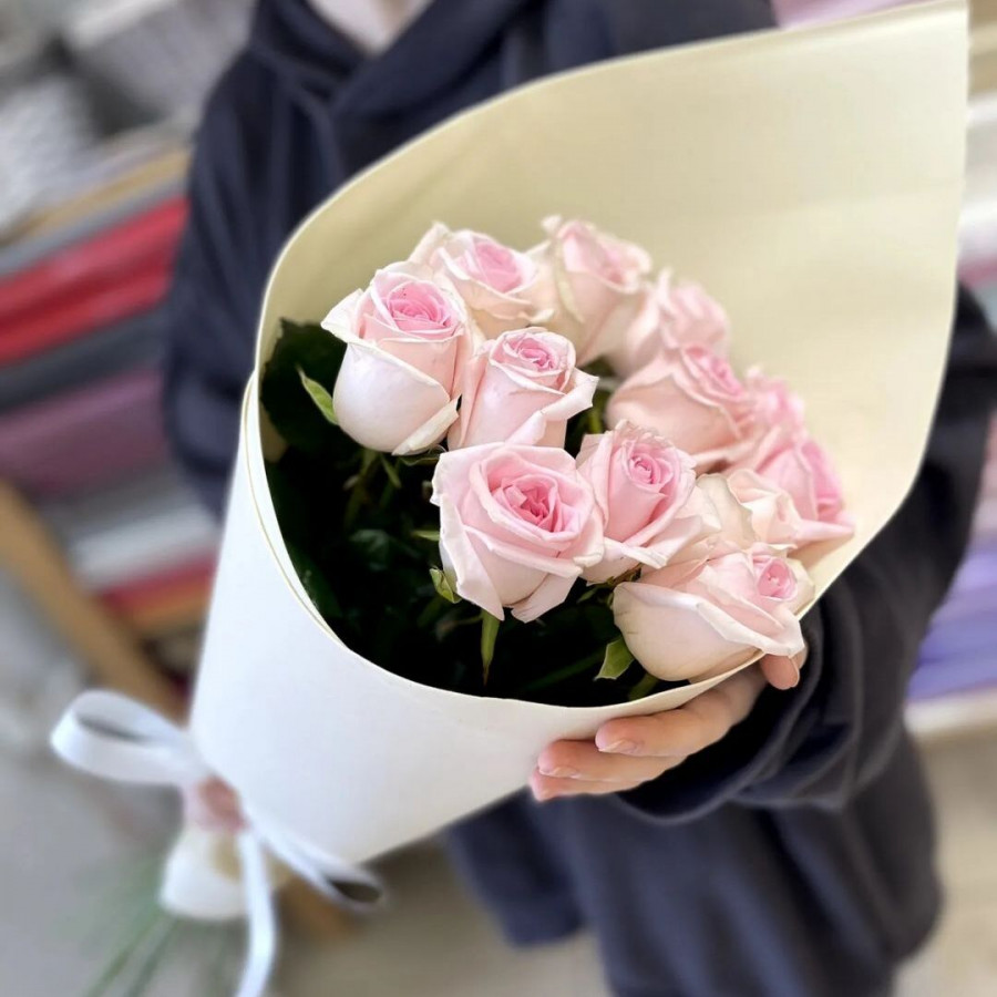 На фото букет из 13 розовых роз. В составе: роза 13 шт, крафт-бумага 1 шт, атласная лента 1 шт, . Все цветы свежие и ароматные, букет красиво оформлен и отлично подходит для подарка. Доступна доставка цветов или самовывоз.