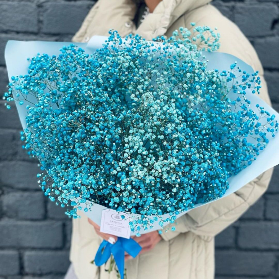 На фото букет из 15 голубых гипсофил. В составе: гипсофила 15 шт, крафт-бумага 1 шт, . Все цветы свежие и ароматные, букет красиво оформлен и отлично подходит для подарка. Доступна доставка цветов или самовывоз.