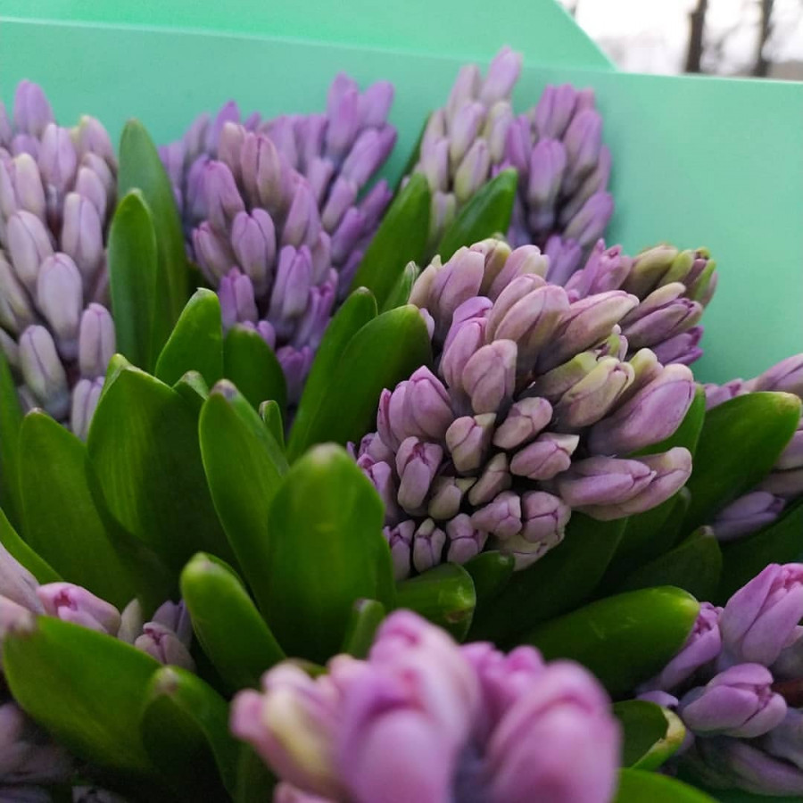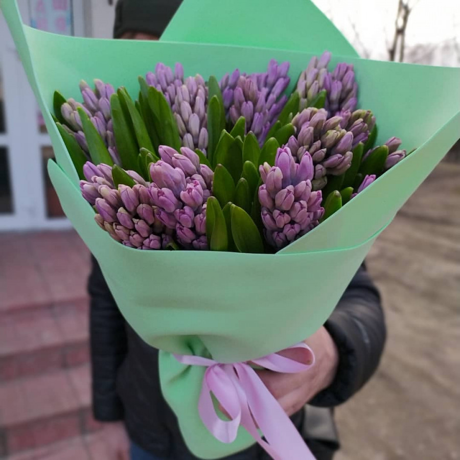 На фото букет из 21 фиолетового гиацинта. В составе: гиацинт 21 шт, крафт-бумага 1 шт, атласная лента 1 шт, . Все цветы свежие и ароматные, букет красиво оформлен и отлично подходит для подарка. Доступна доставка цветов или самовывоз.