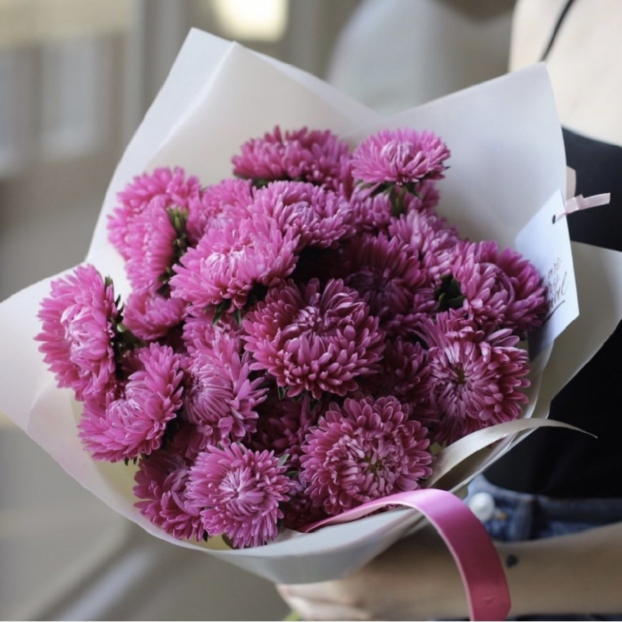 На фото букет из 25 фиолетовых астр. В составе: астра 25 шт, крафт-бумага 1 шт, атласная лента 1 шт, . Все цветы свежие и ароматные, букет красиво оформлен и отлично подходит для подарка. Доступна доставка цветов или самовывоз.