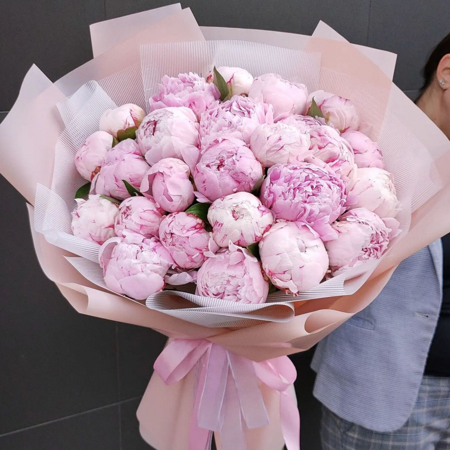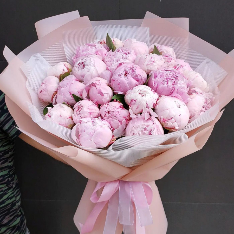 На фото букет из 25 розовых пионов. В составе: пион 25 шт, крафт-бумага 1 шт, атласная лента 1 шт, . Все цветы свежие и ароматные, букет красиво оформлен и отлично подходит для подарка. Доступна доставка цветов или самовывоз.