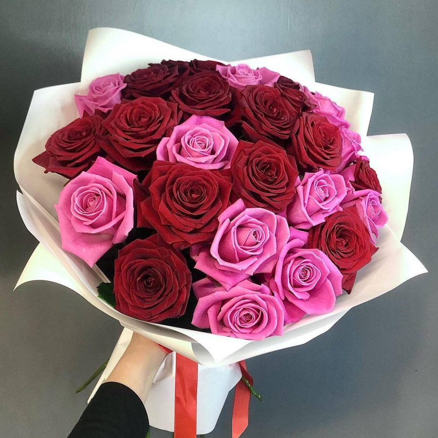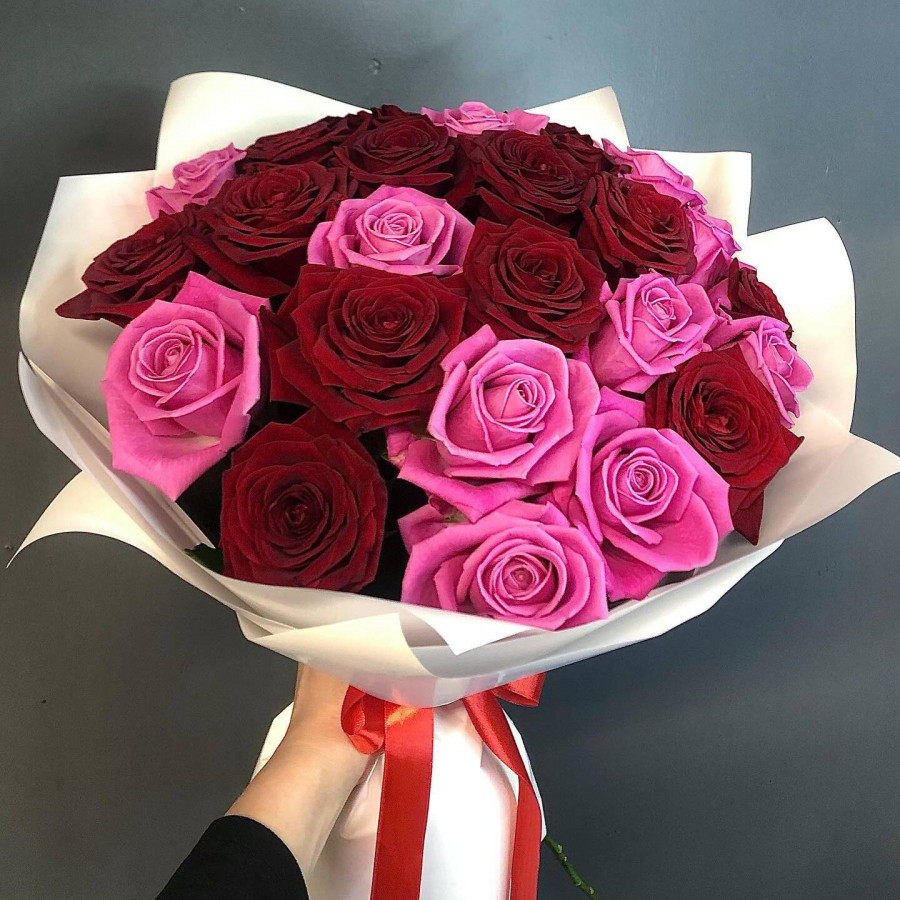 На фото букет из 29 красных и розовых роз. В составе: роза 29 шт, крафт-бумага 1 шт, . Все цветы свежие и ароматные, букет красиво оформлен и отлично подходит для подарка. Доступна доставка цветов или самовывоз.