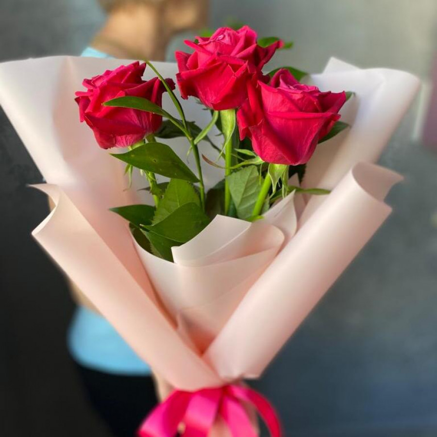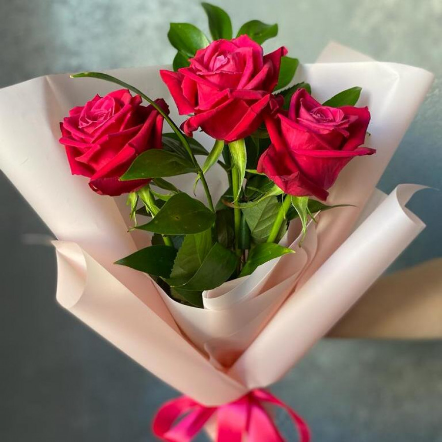 Букет из 3-х красных роз в яркой розовой крафтовой бумаге и атласной ленточкой - идеальный подарок для самых близких и любимых людей! Розы - символ любви и нежности, а крафтовая бумага добавляет букету стильный и современный вид. Атласная лента подчеркивает красоту цветов и делает букет еще более выразительным. Такой подарок всегда будет актуален и вызовет только положительные эмоции у получателя!