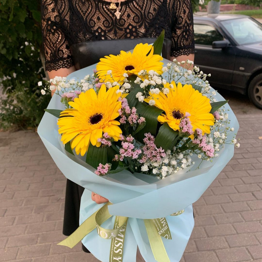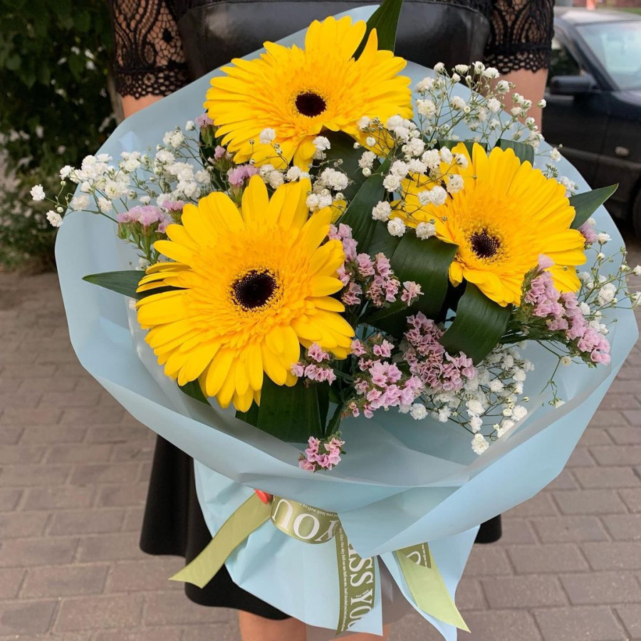 На фото букет из 3 желтых гербер. В составе: гербера 3 шт, гипсофила 2 шт, крафт-бумага 1 шт, атласная лента 1 шт, . Все цветы свежие и ароматные, букет красиво оформлен и отлично подходит для подарка. Доступна доставка цветов или самовывоз.