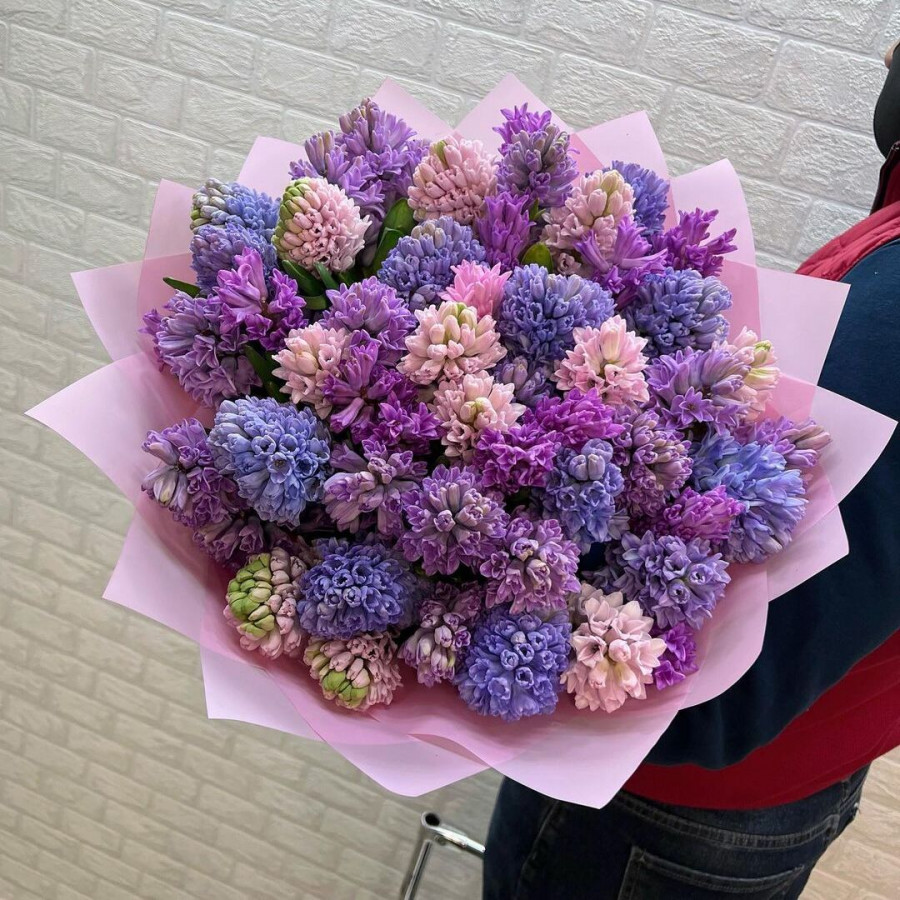 На фото букет из 51 гиацинта. В составе: гиацинт 51 шт, крафт-бумага 1 шт, атласная лента 1 шт, . Все цветы свежие и ароматные, букет красиво оформлен и отлично подходит для подарка. Доступна доставка цветов или самовывоз.