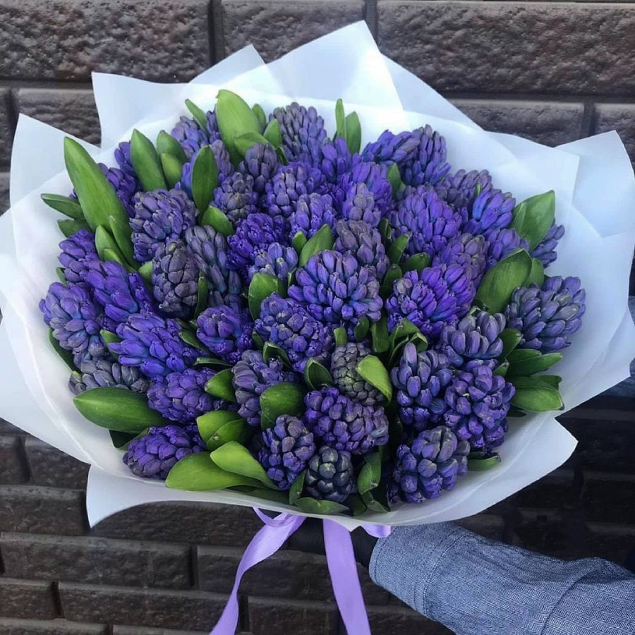 На фото букет из 51 синего гиацинта. В составе: гиацинт 51 шт, крафт-бумага 1 шт, атласная лента 1 шт, . Все цветы свежие и ароматные, букет красиво оформлен и отлично подходит для подарка. Доступна доставка цветов или самовывоз.