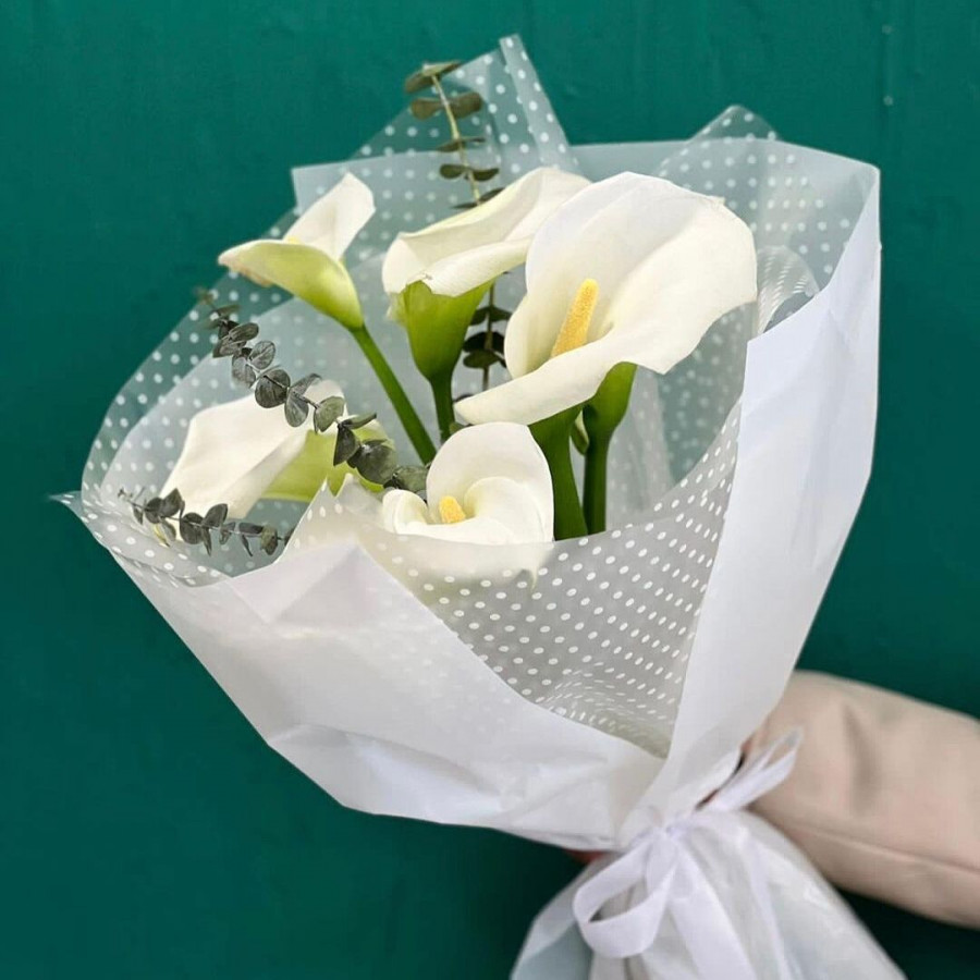 На фото букет из 7 белых калл. В составе: калла 7 шт, эвкалипт 2 шт, крафт-бумага 1 шт, атласная лента 1 шт, . Все цветы свежие и ароматные, букет красиво оформлен и отлично подходит для подарка. Доступна доставка цветов или самовывоз.