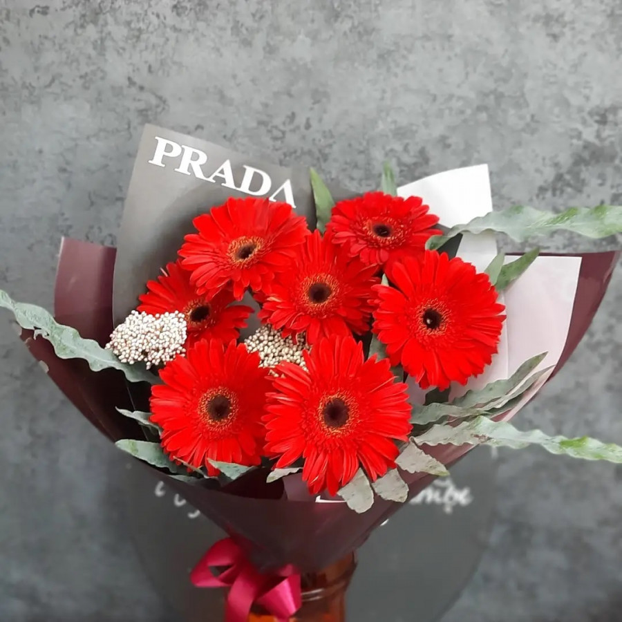 На фото букет из 7 красных гербер. В составе: гербера 7 шт, лимониум 2 шт, крафт-бумага 1 шт, атласная лента 1 шт, . Все цветы свежие и ароматные, букет красиво оформлен и отлично подходит для подарка. Доступна доставка цветов или самовывоз.