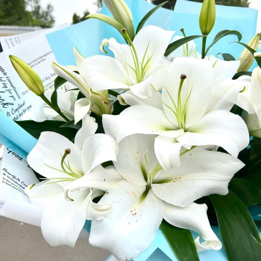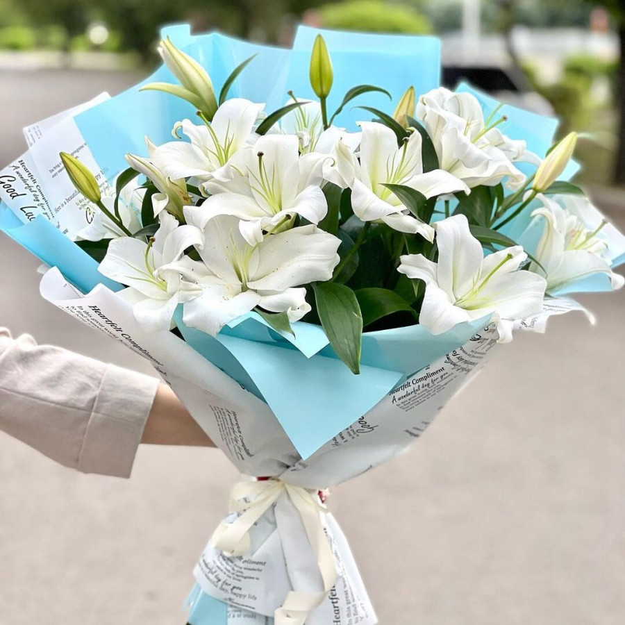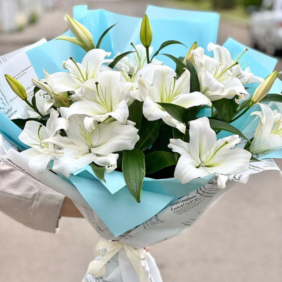 На фото букет из 7 лилий. В составе: лилия 7 шт, крафт-бумага 1 шт, атласная лента 1 шт, . Все цветы свежие и ароматные, букет красиво оформлен и отлично подходит для подарка. Доступна доставка цветов или самовывоз.