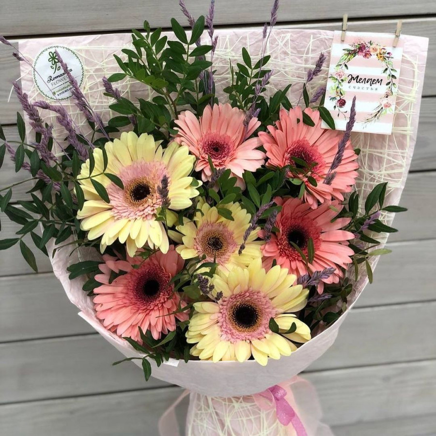 На фото букет из 7 нежных гербер. В составе: гербера 7 шт, писташ 2 шт, статица 2 шт, крафт-бумага 1 шт, атласная лента 1 шт, . Все цветы свежие и ароматные, букет красиво оформлен и отлично подходит для подарка. Доступна доставка цветов или самовывоз.