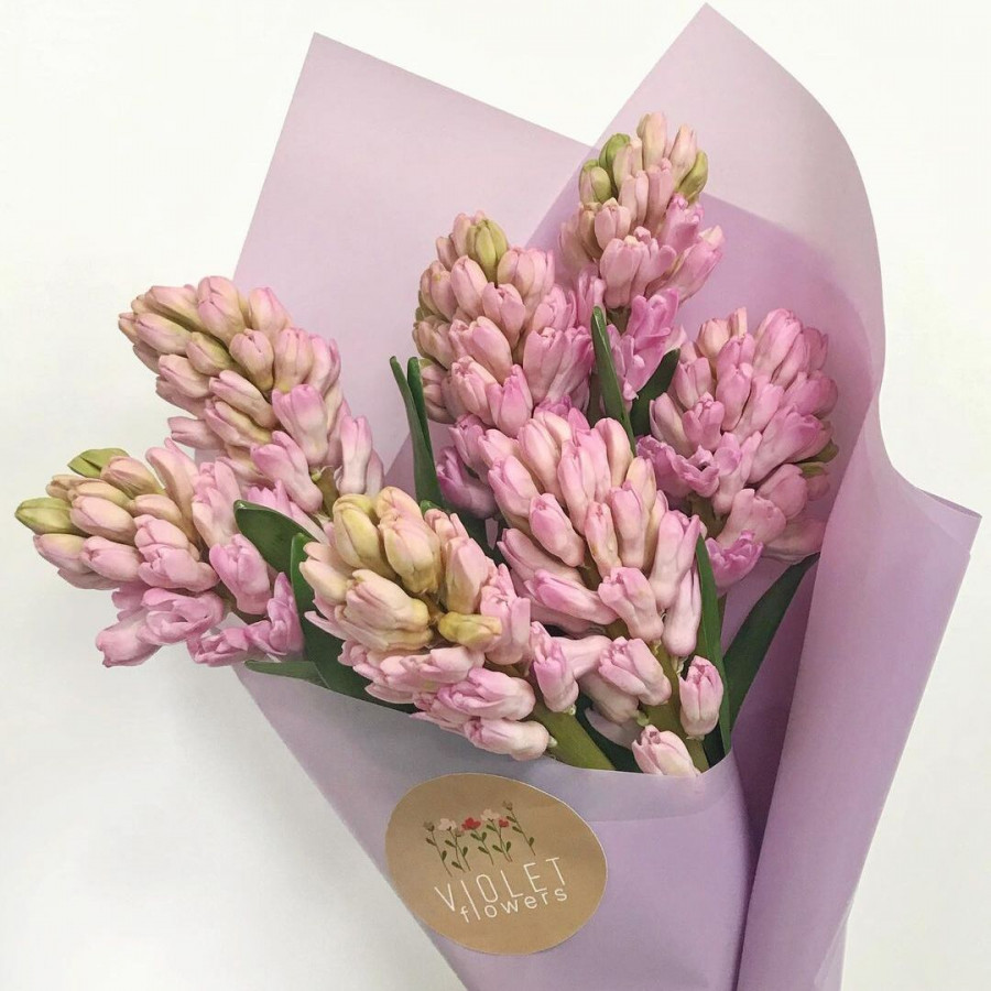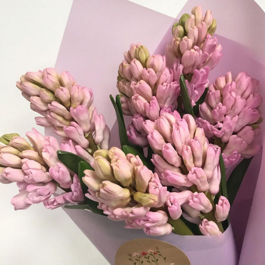 На фото букет из 9 розовых гиацинтов. В составе: гиацинт 7 шт, крафт-бумага 1 шт, атласная лента 1 шт, . Все цветы свежие и ароматные, букет красиво оформлен и отлично подходит для подарка. Доступна доставка цветов или самовывоз.