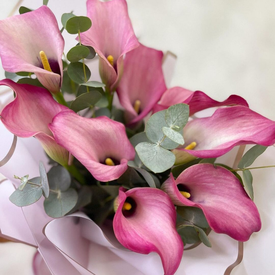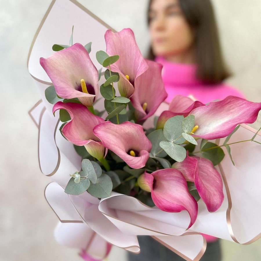 На фото букет из 9 розовых калл. В составе: калла 9 шт, эвкалипт 4 шт, крафт-бумага 1 шт, атласная лента 1 шт, . Все цветы свежие и ароматные, букет красиво оформлен и отлично подходит для подарка. Доступна доставка цветов или самовывоз.