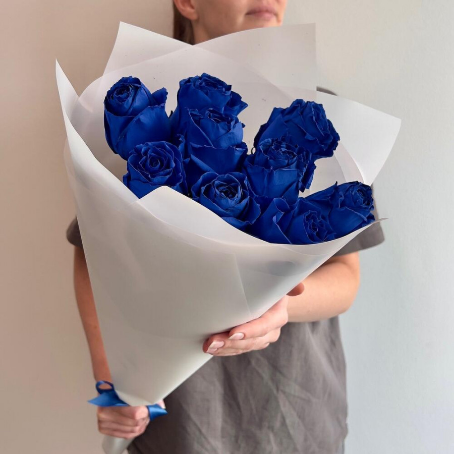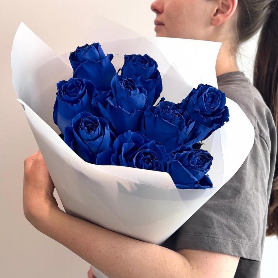 На фото букет из 9 синих роз. В составе: роза 9 шт, дизайнерская упаковка 1 шт, атласная лента 1 шт, . Все цветы свежие и ароматные, букет красиво оформлен и отлично подходит для подарка. Доступна доставка цветов или самовывоз.