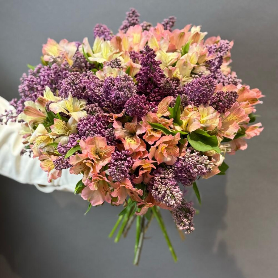 На фото букет из альстромерий и сирени. В составе: сирень 17 шт, альстромерия 14 шт, атласная лента 2 шт, . Все цветы свежие и ароматные, букет красиво оформлен и отлично подходит для подарка. Доступна доставка цветов или самовывоз.