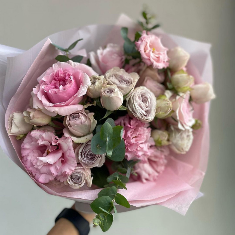 На фото букет из белых пионовидных роз. В составе: кустовая пионовидная роза 4 шт, эустома (лизиантус) 3 шт, роза 2 шт, эвкалипт 1 шт, крафт-бумага 1 шт, . Все цветы свежие и ароматные, букет красиво оформлен и отлично подходит для подарка. Доступна доставка цветов или самовывоз.