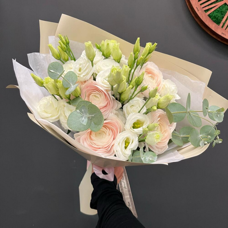 На фото букет из эустом и ранункулюсов. В составе: эустома (лизиантус) 4 шт, ранункулюс 5 шт, эвкалипт 3 шт, дизайнерская упаковка 1 шт, атласная лента 1 шт, . Все цветы свежие и ароматные, букет красиво оформлен и отлично подходит для подарка. Доступна доставка цветов или самовывоз.