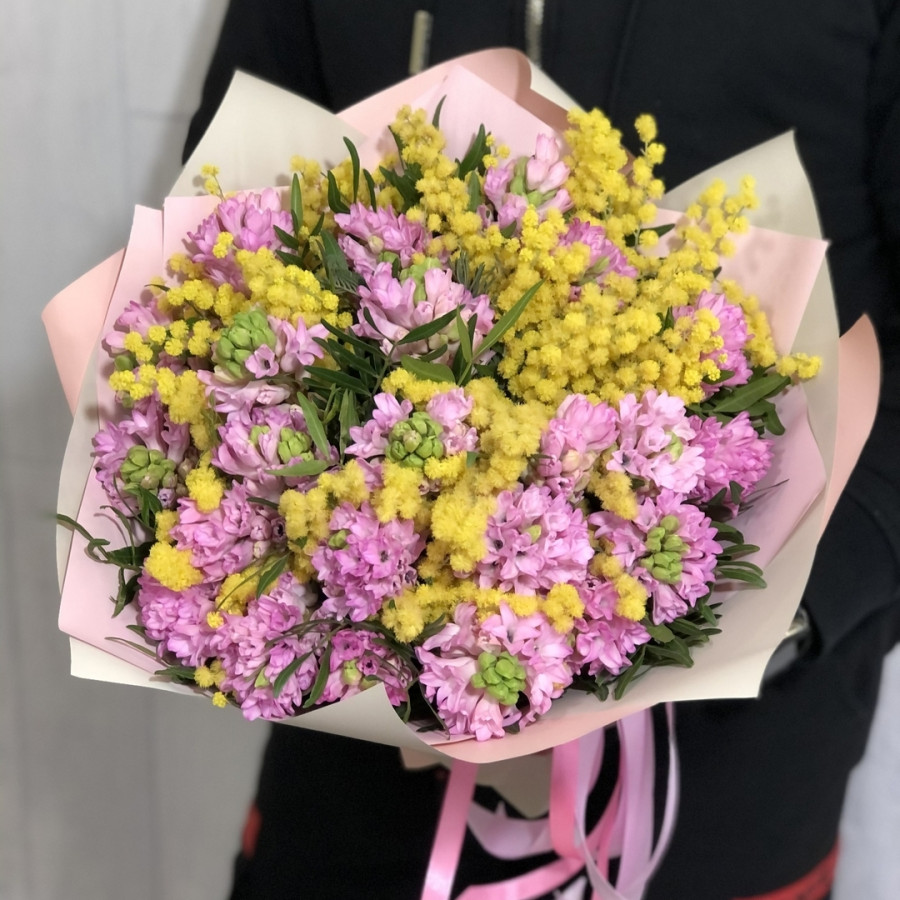 На фото букет «мимоза и гиацинты». В составе: гиацинт 25 шт, мимоза 6 шт, крафт-бумага 1 шт, атласная лента 1 шт, . Все цветы свежие и ароматные, букет красиво оформлен и отлично подходит для подарка. Доступна доставка цветов или самовывоз.