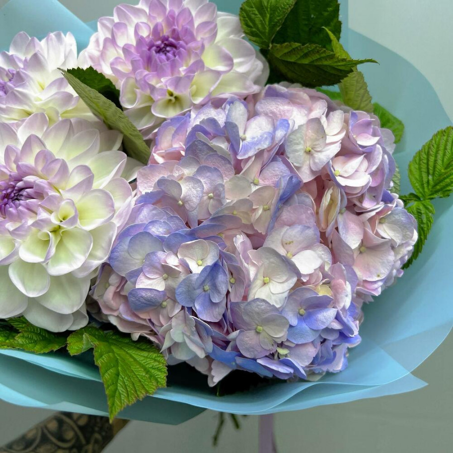 На фото букет из гортензии и георгинов. В составе: георгина 3 шт, гортензия 1 шт, зелень 4 шт, дизайнерская упаковка 1 шт, атласная лента 1 шт, . Все цветы свежие и ароматные, букет красиво оформлен и отлично подходит для подарка. Доступна доставка цветов или самовывоз.