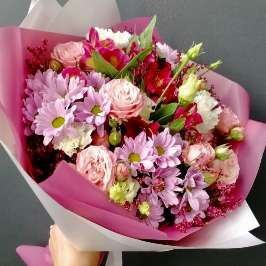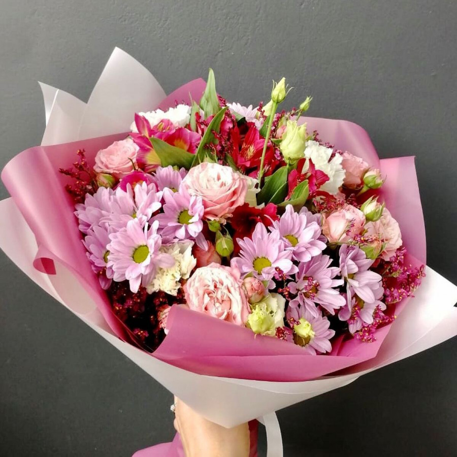 На фото букет из хризантемы, альстромерии и роз. В составе: хризантема кустовая 2 шт, альстромерия 2 шт, кустовая роза 2 шт, роза 1 шт, эустома (лизиантус) 1 шт, гвоздика 1 шт, лимониум 1 шт, крафт-бумага 1 шт, . Все цветы свежие и ароматные, букет красиво оформлен и отлично подходит для подарка. Доступна доставка цветов или самовывоз.
