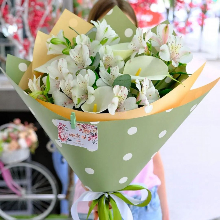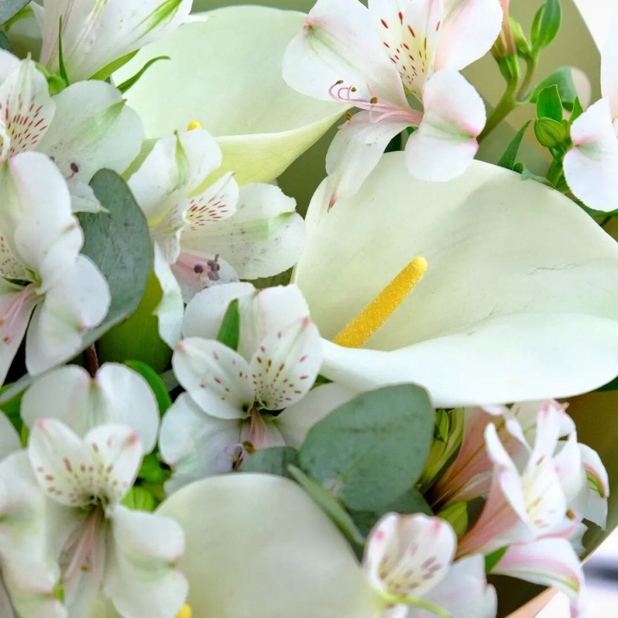 На фото букет из калл и альстромерии. В составе: альстромерия 11 шт, калла 5 шт, эвкалипт 3 шт, крафт-бумага 1 шт, атласная лента 1 шт, . Все цветы свежие и ароматные, букет красиво оформлен и отлично подходит для подарка. Доступна доставка цветов или самовывоз.
