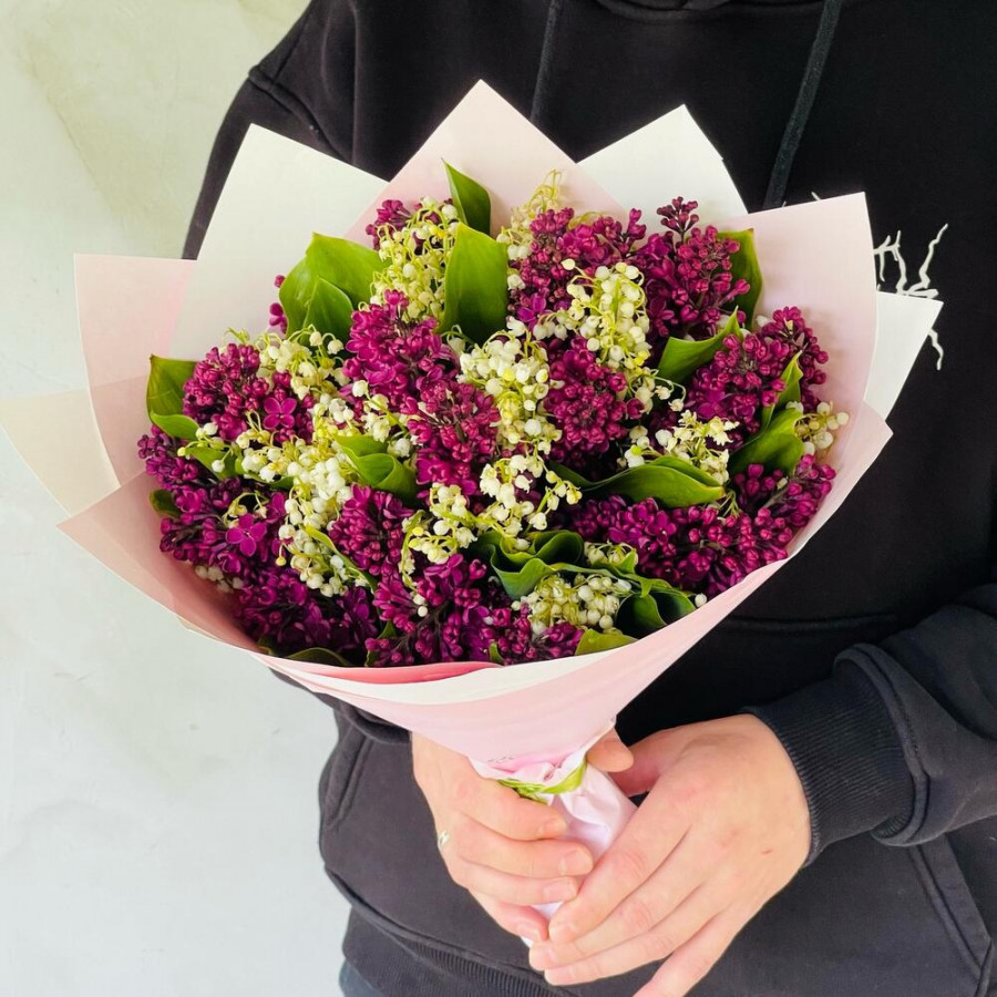 На фото букет из ландышей и сирени. В составе: сирень 7 шт, ландыш 5 шт, дизайнерская упаковка 1 шт, атласная лента 1 шт, . Все цветы свежие и ароматные, букет красиво оформлен и отлично подходит для подарка. Доступна доставка цветов или самовывоз.