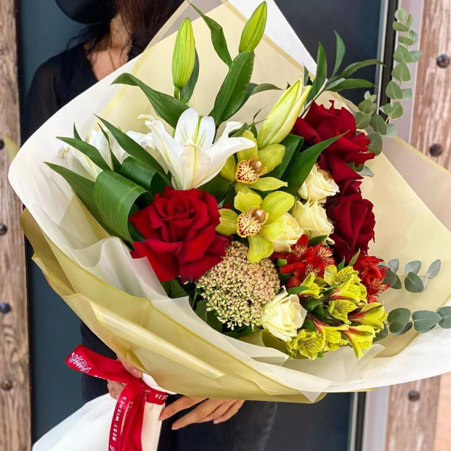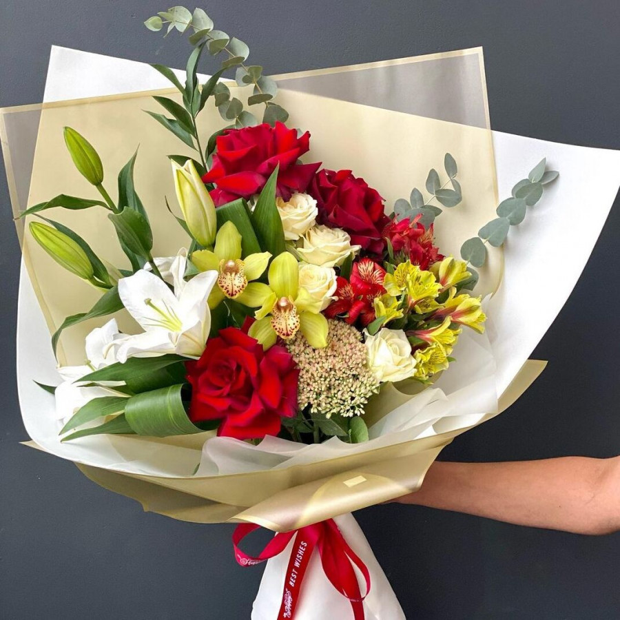 На фото букет из лилий и красных роз. В составе: лилия 2 шт, роза 5 шт, кустовая роза 2 шт, орхидея 2 шт, эвкалипт 2 шт, крафт-бумага 1 шт, атласная лента 1 шт, . Все цветы свежие и ароматные, букет красиво оформлен и отлично подходит для подарка. Доступна доставка цветов или самовывоз.