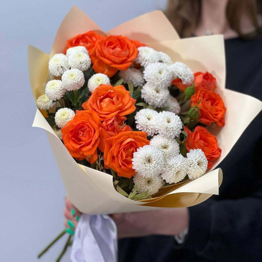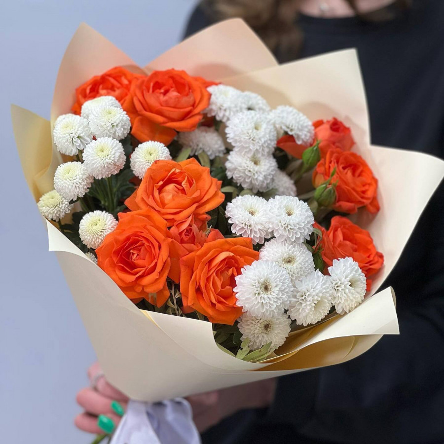 На фото букет из оранжевых роз и хризантем. В составе: роза 10 шт, хризантема кустовая 3 шт, крафт-бумага 1 шт, . Все цветы свежие и ароматные, букет красиво оформлен и отлично подходит для подарка. Доступна доставка цветов или самовывоз.