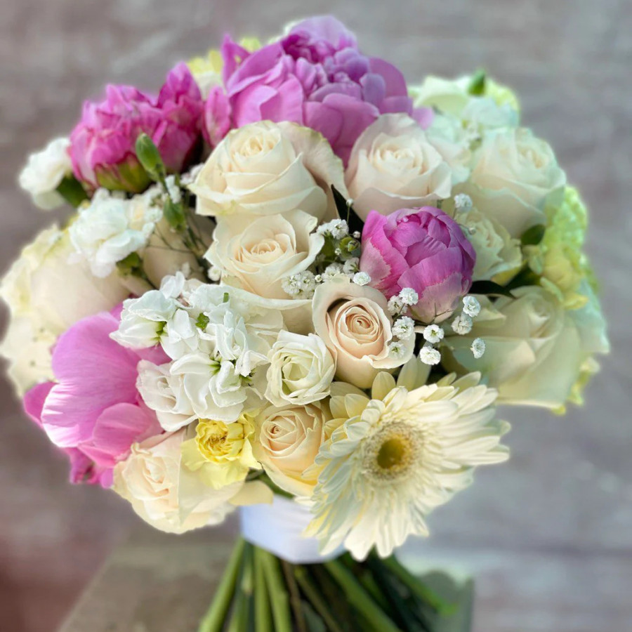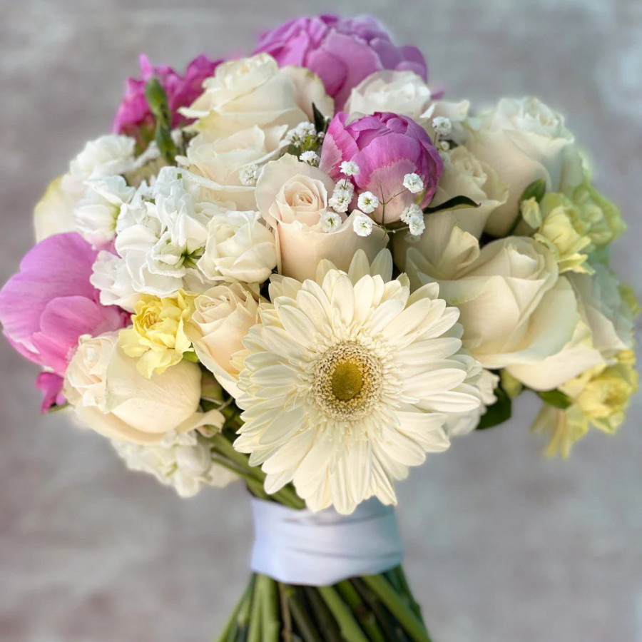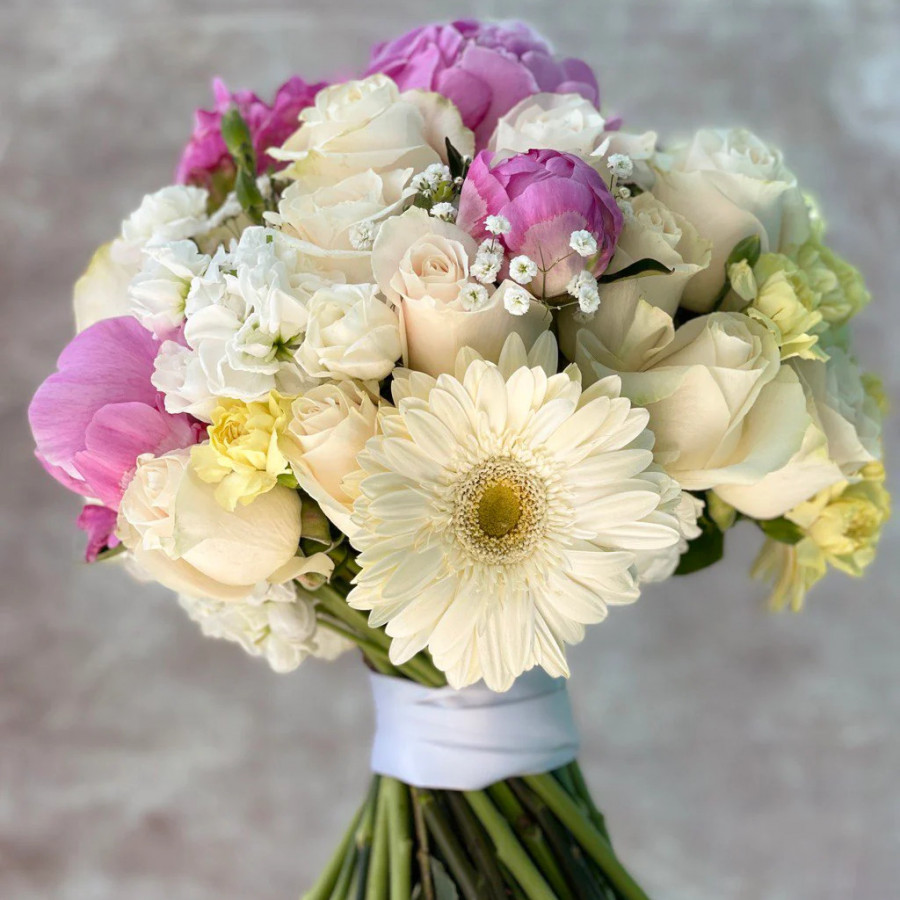 На фото букет из пионов и гербер. В составе: пион 5 шт, гербера 4 шт, роза 5 шт, кустовая роза 2 шт, эустома (лизиантус) 2 шт, гипсофила 1 шт, атласная лента 1 шт, . Все цветы свежие и ароматные, букет красиво оформлен и отлично подходит для подарка. Доступна доставка цветов или самовывоз.