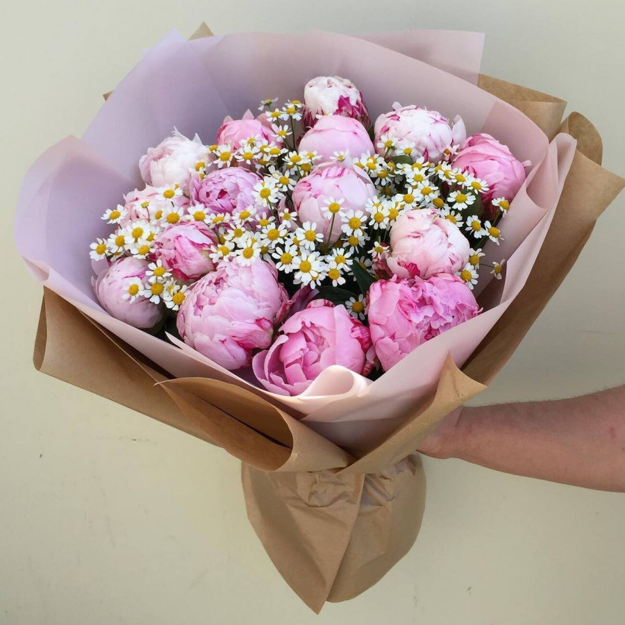 На фото букет из пионов и ромашек. В составе: пион 15 шт, ромашки 3 шт, крафт-бумага 1 шт, атласная лента 1 шт, . Все цветы свежие и ароматные, букет красиво оформлен и отлично подходит для подарка. Доступна доставка цветов или самовывоз.