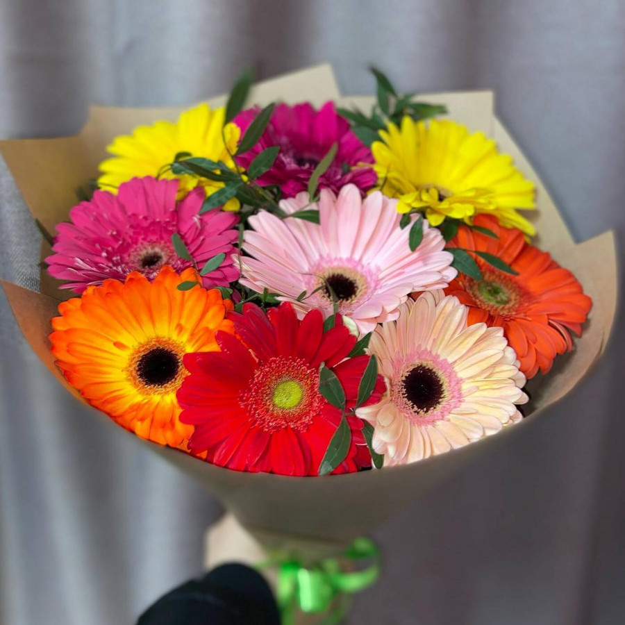 На фото букет из разноцветных гербер. В составе: гербера 9 шт, писташ 2 шт, крафт-бумага 1 шт, атласная лента 1 шт, . Все цветы свежие и ароматные, букет красиво оформлен и отлично подходит для подарка. Доступна доставка цветов или самовывоз.