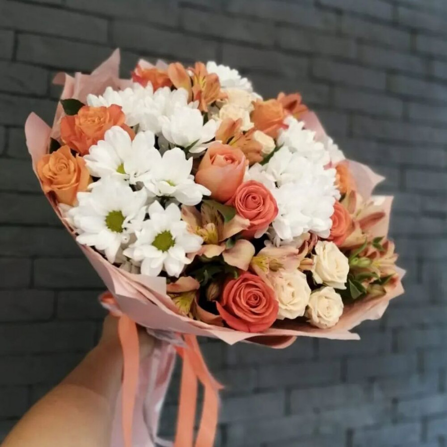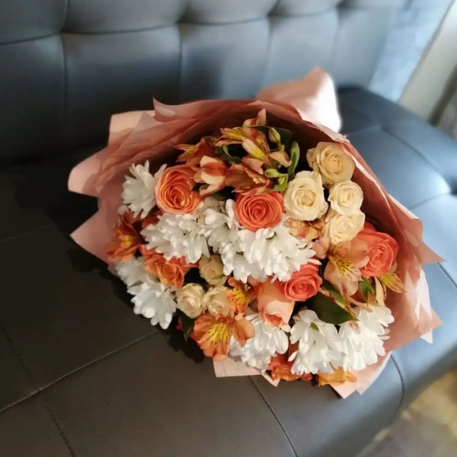 На фото букет из роз, хризантем и альстромерий. В составе: роза 7 шт, хризантема кустовая 3 шт, альстромерия 5 шт, крафт-бумага 1 шт, атласная лента 1 шт, . Все цветы свежие и ароматные, букет красиво оформлен и отлично подходит для подарка. Доступна доставка цветов или самовывоз.