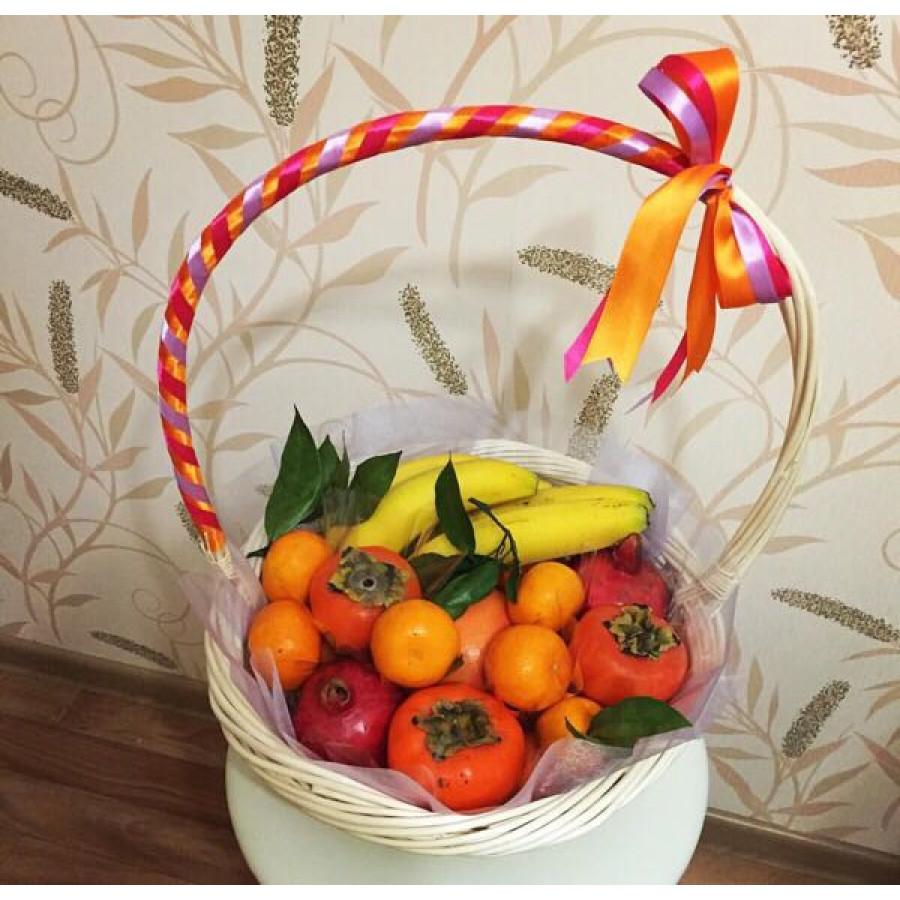Витаминный заряд в подарок вместе с корзиной фруктов для тех, о ком Вы заботитесь. Здесь и мандарины, апельсины, гранат, хурма, бананы. Корзина украшена атласными лентами. Такой подарок придется по вкусу последователям здорового образа жизни.