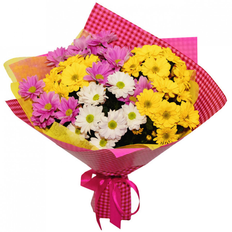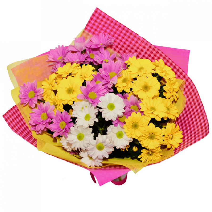 Яркое сочетание семи веток красочних разноцветных кустовых хризантем белого, желтого и розового цвета и сочной упаковки из фетра. Такой броский букет станет чудесным комплиментом для поднятия настроения получательницы без повода и колоритным подарком на праздник.