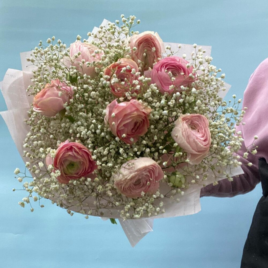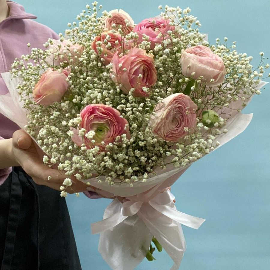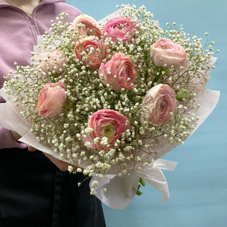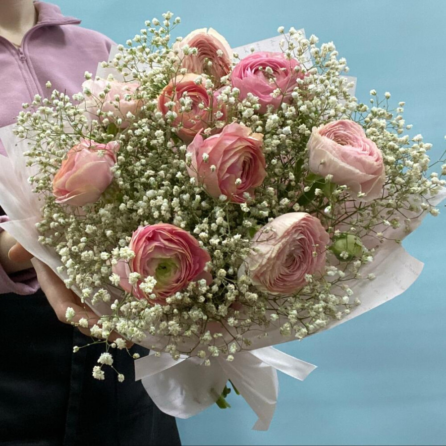 Букет из розовых ранункулюсов с белой гипсофилой в Ижевске