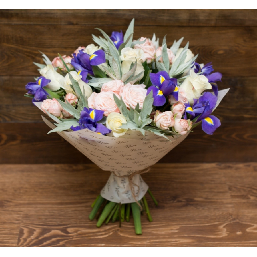 Необычный, яркий, весенний, заряжающий свежестью, бодростью и превосходным настроением букет из семи ирис, такого же количества роз и органичных вкраплений из веточек кустовых роз, украшенный свежайшей декоративной зеленью. Такая композиция идеально подойдет для вручения любимой женщине, маме, дочке, сестре, коллеге, подруге. Невероятный аромат и стойкость цветов будут радовать счастливого получателя долгое время.