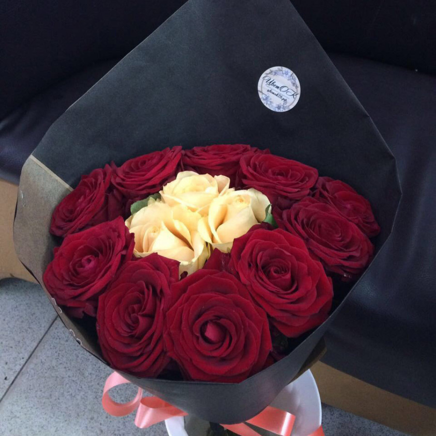 Яркий букет из 10 красных роз и 2 кремовых в центре без всяких сомнений вызовет восторг у прекрасного пола! Необычная подача в темном крафте, сладкий аромат роз и бархатистые лепестки покорят получательницу, такой подарок незаменим на любом торжестве.